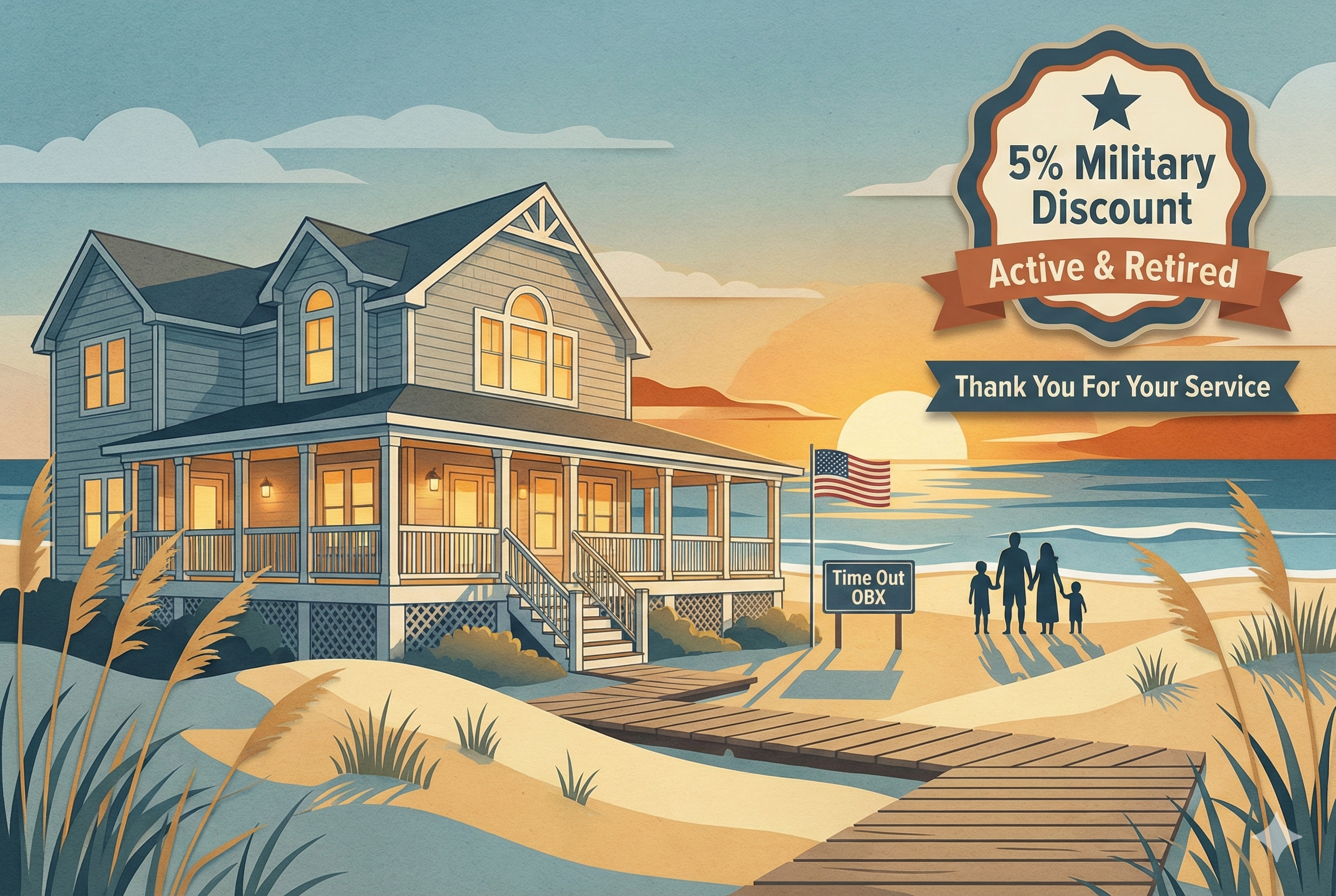 We are proud to announce that Time Out OBX offers a 5% Military Discount to active and retired military members. It is our small way of saying thank you for your service and sacrifice. Whether you are planning a post-deployment reunion, a retirement celebration, or simply a much-needed family escape, we want to help make your Outer Banks vacation a reality.